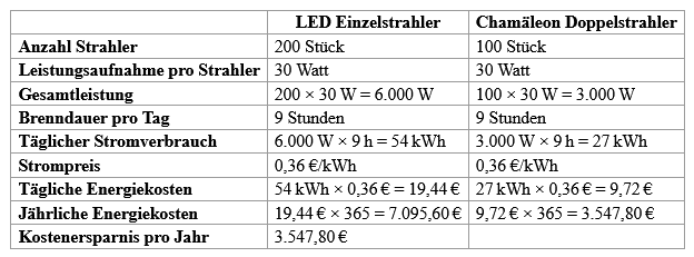 Rechen­bei­spiel über die Erspar­nis bei einer Laden­be­leuch­tung mit 200 Stück LED Ein­zel­strah­ler her­kömm­li­cher Art und 100 Stück Cha­mä­le­on Dop­pel­strah­ler (mit bes­se­rer Beleuchtungsstärke)